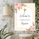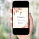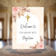 Golden marble print as background decorated with a golden cross, pampas grass and blush pink flowers and a white arched shaped frame. Personalize and add a name.