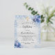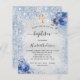 A modern, elegant baptism, celebrating a baby boy. Faux silver looking background decorated with blue faux glitter and florals. A golden cross. Personalize and add a name and party details. Black colored letters.