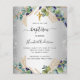 A faux silver looking background decorated with eucalyptus greenery and golden leaves and faux silver glitter sparkles. A golden cross. Personalize and the child's name and ceremony details.
