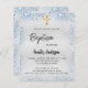 A modern, elegant baptism, celebrating a baby boy. Faux silver looking background decorated with blue faux glitter sparkles and a golden cross. Personalize and add a name and party details. Black colored letters.