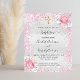 A modern, elegant baptism, celebrating two baby girls, twins. Faux silver metallic looking background decorated with pink faux glitter sparkles, a golden cross and florals, flowers. Personalize and add names and ceremony details. Black colored letters.