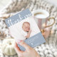 This simple and stylish Baptism or Christening thank you card features a photo of your baby, with elegant modern white script typography and a matching cross on a soft blue background.