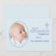 The soft blue background has the word "Baptism" and is embellished by an intricate blue cross. The oval photo window is also framed in blue. Coordinates beautifully with our Baptism Word Blue Photo Invitation.