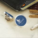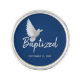 Lapel pin shown with a white dove on a deep sapphire blue background. White text of "Baptized" written in a script. Custom Date you were baptized.