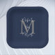 What a wonderful, personalized paper plate for a Jewish Bar Mitzvah Party Reception. Background is navy blue, monogram is gray, name is white. Choose square or round. All Rights Reserved © 2024 Alan & Marcia Socolik.