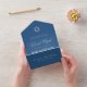 The background is a classic blue. The fold has faux silver foil borders on both sides. All text is light gray, except the letter M, that is blue. In the upper part of the invitation, above all text, it has a star of David from faux silver foil.