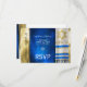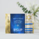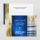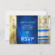 Customize this Bar Mitzvah RSVP with a prayer shawl in blue and gold colors.