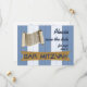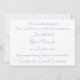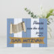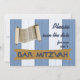 On a painted wood background of blue and white stripes is shown a view of the Torah, partially rolled out, and the request to please save the date for a Bar Mitzvah in decorative dark blue lettering. This card is intended as an early note, with a more formal, detailed invitation to be sent later. The text on the reverse is easily edited using the customization tools.