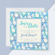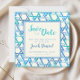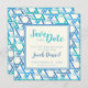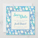 This modern, light and fresh save-the-date card is perfect for a Bar Mitzvah celebration. It features an teal blue pattern of the Jewish symbol of the Star of David, and a watercolour-style font.