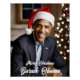 This artwork has the 44th president of the USA Barack Obama wearing a Santa hat near a decorated tree.