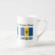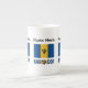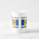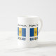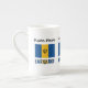 Bone China mug featuring the Barbadian Flag with the word BARBADOS below in the colors of the flag. A place for your name allows for a personalized look. If you need a customized gift just add someone else's name. The Bajan flag is ultramarine and gold with a black trident. Design shows on three sides of mug.