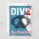 Barbados Caribbean vintage scuba mask travel poster design. A blue and white diver down flag background with a retro scuba mask and word "Dive" at the top.