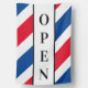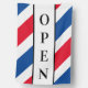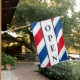 Open for business sign. Barber shop open sign flag. Blue and red and white diagonal stripes.