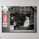 From 1941, it's winter and icicles hang from the Barber Shop pole. There are no customers and the barber strikes a contemplative pose in the window of his Harrisonburg, Virginia shop.