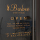 Trendy modern elegant barber hairstylist barbershop name men salon opening hours signage window cling with gold copper bold typography script with scissors and pole. ++++++++++++ Suitable for barber shop, men salon, professional hairstylist. +++++++++++++++++++++ Easy to personalize with your salon or stylist name, call for appointments phone no, and your text.
