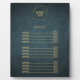 Luxury exclusive price list for a barber hairstylist shop with faux gold typography and a small geometric frame on a dark navy chalkboard background. ++++++++++++ Easy to personalize with your salon name and list of services.