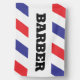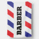 Barber open for business outdoor flag sign. Red, white and blue stipes with Barber in black block text.