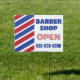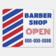 Barber Shop business OPEN sign with attention getting red and blue traditional barber pole stripes design. Edit all text.