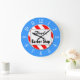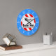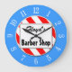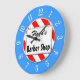 A unique wall clock reading Barber Shop in block letters with room for your name in retro script on a red and white striped background surrounded by white letters on a blue face. Click Customize It to change fonts, sizing, background colors and more, even save your design for later.