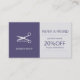 Elegant and simple refer a friend card for a barber hairstylist in light grey and navy blue with a scissors logo (you can replace it with your own) and a starred pattern on the back side.