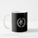 Luxury exclusive mug for a barber hairstylist with faux metallic silver logo on a black leather look background. Please note that the leather and silver look are both printed.