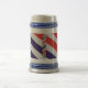 This mug is decorated with diagonal red, white, and blue, stripes and three Barber Poles.
