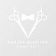 Simple masculine white window cling for barbers and barbershops that features modern minimal typography and an abstract illustration of a bowtie and scissors forming the lapels of a jacket.