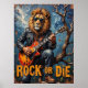 This striking artwork features a cool lion, sporting sunglasses and a leather jacket, intensely playing an electric guitar while perched on the gnarled branches of a bare tree. A textured blue and white sky forms the backdrop. The painting's thick, expressive brushstrokes give a dynamic and raw energy to the scene, perfectly conveying the "Rock or Die" spirit.