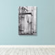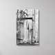 'Barn Door with Tree' Canvas Print is a rustic image of the worn weathered wood of a latched barn door with a tree growing against the outside wall of boards. Black and white image.