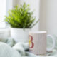 Pretty mug features decorated rustic red barn wood letter / initial B has with sunflower bouquet embellishment on a beige burlap background.
