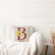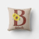 Pretty pillow features decorated rustic red barn wood letter / initial B has with sunflower bouquet embellishment on a beige burlap background.
