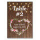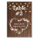 Newlywed names and wedding date in pink floral ribbon heart with glowing light string on rustic barn wood for table number.
