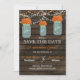 Rustic Barnwood, dangling string lights with orange flowers in a mason jar wedding Save the date. Matching products also available.
