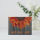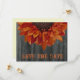 Save the date announcement featuring an image of an orange sunflower with orange text "Save The Date" on front. Background is barnwood. Personalize back with names and date. Look for matching items in the Weddings category of The Pink Schoolhouse.