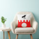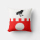 "Per fess embattled argent and gules, in pale a raven, close and sinister facing, sable and a plate argent." Populace badge for the Barony of Raven's Fort in the Society for Creative Anachronism. Back of pillow is a medieval-style pattern in coordinating colors.