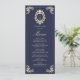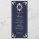 Elegant navy blue and gold baroque wedding menu featuring a vintage victorian monogram, ornate flourishes, and classic frame accents. Perfect for a luxury reception, this double-sided menu template displays a refined order of courses with timeless style. Coordinates with the full baroque navy and gold wedding invitation suite for a cohesive and sophisticated look.