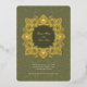 This exquisite wedding invitation features an intricate Baroque ornament design in radiant gold foil against a rich olive green background. The ornate detailing frames the couple’s names and event details, adding a luxurious touch to the overall aesthetic. The reverse side continues the opulent theme with a matching Baroque-inspired pattern, making this invitation perfect for formal weddings that embrace classic elegance and grandeur. Ideal for couples seeking a timeless and sophisticated design, this card is sure to make a lasting impression.