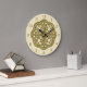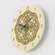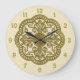 This elegant clock has an intricate gold filigree circle medallion resembling aged brass, surrounded by antique gold numbers. The background is cream colored with a light repeating abstract floral pattern, which adds a feel of luxury. Add an extravagant look to your home with this clock.