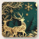 An ornate paper-cut-style illustration in rich gold and green, depicting twin baroque stags in a snow-covered evergreen forest. Detailed silhouettes and swirling patterns evoke the enchantment and mystery of the season. Snowflakes, stars, and a glowing moon complete the scene, adding depth and serenity to this timeless holiday design.