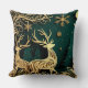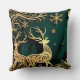 An ornate paper-cut-style illustration in rich gold and green, depicting twin baroque stags in a snow-covered evergreen forest. Detailed silhouettes and swirling patterns evoke the enchantment and mystery of the season. Snowflakes, stars, and a glowing moon complete the scene, adding depth and serenity to this timeless holiday design.