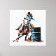 Pop art style graphic image in brown, blue and black of a girl racing with her horse around a barrel with her hair flying.