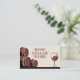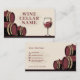 A business card with an illustration of barrels and a wine glass in beige and burgundy color. It could be used for a wine cellar shop, a winemaker, a sommelier, etc. It includes opening hours on the back.