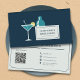 A business card with an illustration of a cocktail shaker and a martini glass on a dark blue background. Perfect for a bartender, a pub, a mixologist or a party barkeeper. On the back, you can find full customizable information and a QR Code.