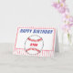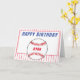 Baseball birthday greeting card for kids. This personalized baseball birthday greeting card has a Happy birthday wish, name in the baseball ball and red stripes on white. Personalize the card with your name. Inside the card is another ball and stripes. The color scheme is red, blue and white. Great greeting card for a kid who loves baseball and sport.