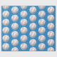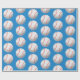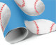 Cute kid's wrapping paper for birthday gift wrapping featuring an illustration of a baseball made into a pattern. The background is blue.