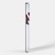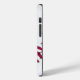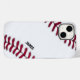 Custom baseball iPhone case, with graphics of the red style stitching of a baseball, in the upper left corner and the lower right corner of the white case. Personalize the black text to suit your needs.