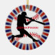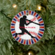 Baseball Design Ornament, featuring a baseball and baseball player silhouette on a red, blue and gray starburst background, with customizable personalization on both sides.
