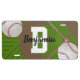 This personalized license plate has a baseball fans design with a baseball field and two illustrated baseballs. Personalized this license plate with a first or last name and a initial. A great personalized gift to give the baseball fan in your life.