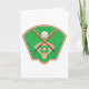 This design is a baseball field. The perspective is looking down on the field. You can see the diamond and then the outfield. Overlaid on the top is two baseball bats crossing each other and a baseball. This baseball field design looks great on these greeting cards