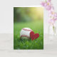 This design shows a bright white baseball resting in fresh green grass, with a glittery red heart leaning close against it as if the two are keeping each other company 🥰. The baseball’s dark red stitching curves around its surface, echoing the heart’s deep crimson sparkle ❤️. Warm sunlight streams in from the upper right, laying a golden highlight across the ball and making the heart’s shimmer catch in tiny points. The background fades into a soft blur of greens with hints of yellow, like a sunlit field stretching out beyond the foreground. Any text would sit best along the top in a gentle white or pale gold, staying readable against the darker green blur. A smaller line could be placed near the bottom in muted red to mirror the stitching without stealing focus from the objects. In the lower half of the scene, sharp blades of grass frame the baseball and heart while the rest dissolves into creamy bokeh behind them.